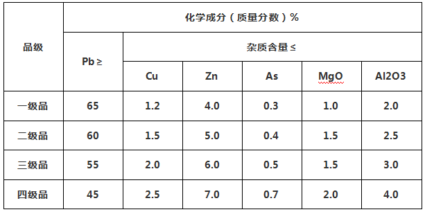 铅精矿按化学成分分成一级品、二级品、三级品和四级品,铅精矿化学成分应符合下表要求