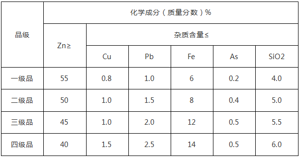锌精矿按化学成分分为一级品、二级品、三级品和四级品。锌精矿化学成分英符合下表要求