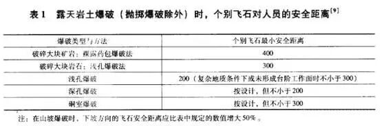 露天岩土爆破时,个别飞石对人员的安全距离见表1。设计时应参考表1中的值来确定爆破警戒范围。在此范围内不得有任何人员,且让所有无关人员远离警戒线,起爆时坚守在警戒线上的爆破警戒人员要在能抵御飞石冲击的避炮棚内。